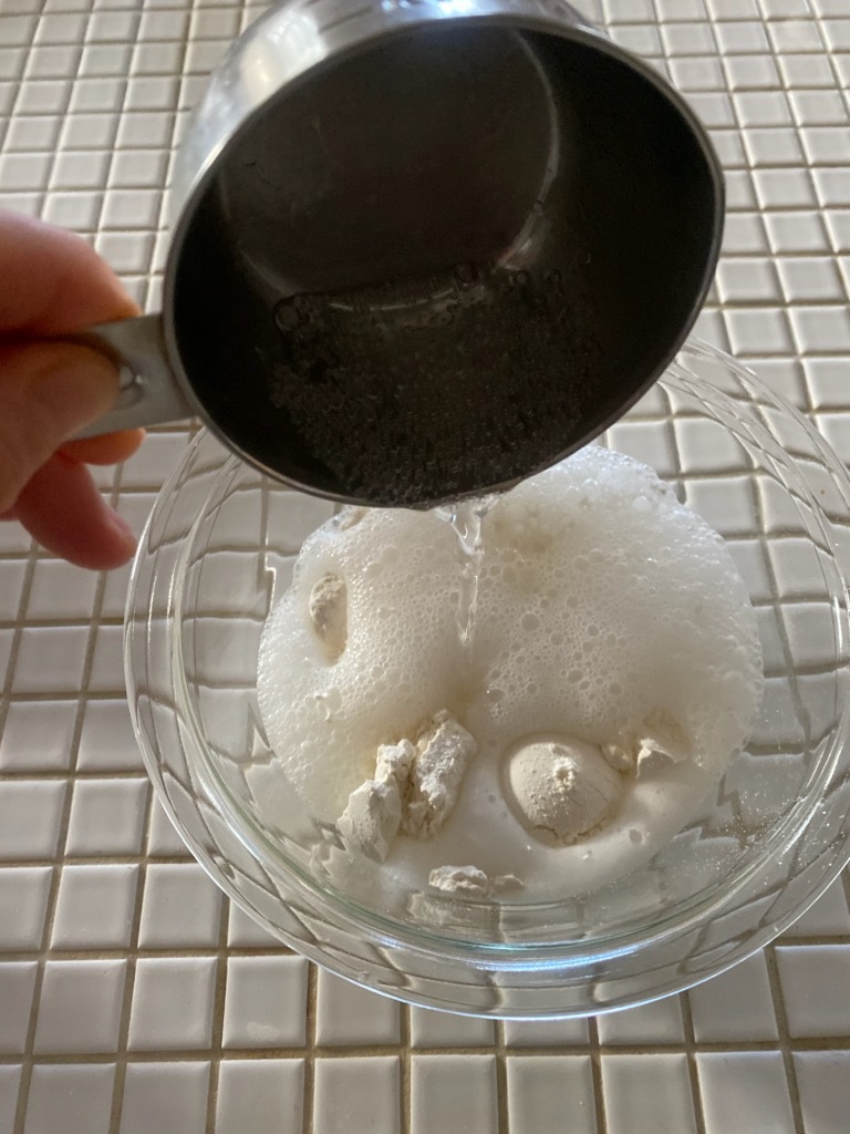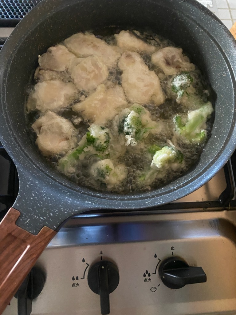 フライパンに高さ2cmほどの油を入れて火にかけたら1に2の衣をつけて中温で揚げる。