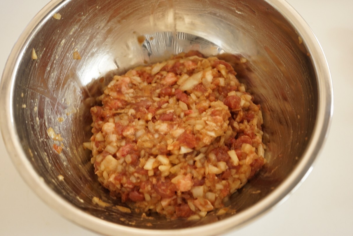 ボウルに豚ひき肉・しょうゆ・オイスターソース・砂糖・水・こしょう・ごま油を入れ、お箸で混ぜる。豚ひき肉が水分をしっかり吸ったら、しょうが・玉ねぎ・椎茸・片栗粉を入れてしっかり混ぜておく。
