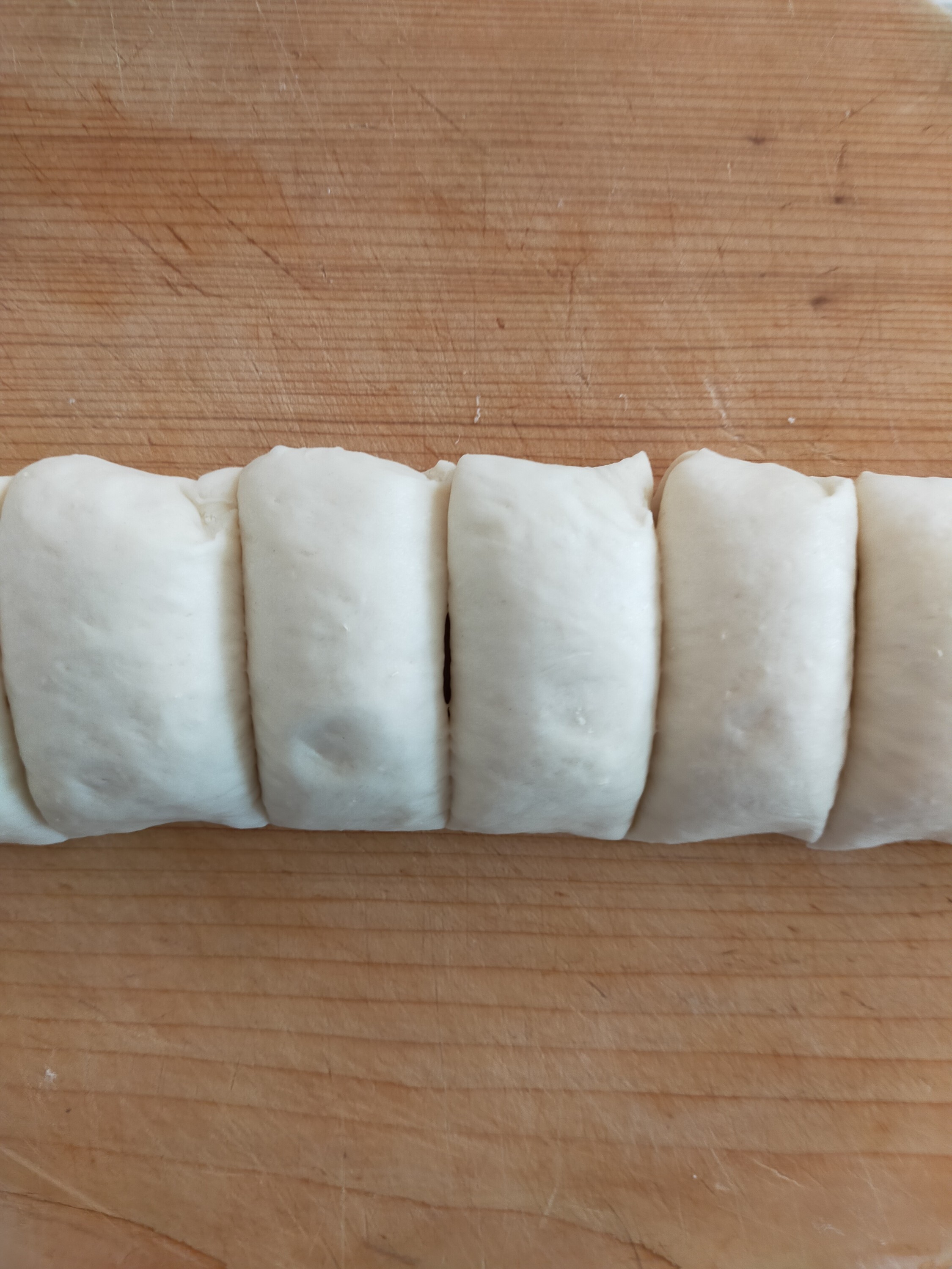 - 水・牛乳は合わせて人肌に温め、1に入れて粉っぽさがなくなるまでお箸で、混ぜサラダ油を入れてさらに混ぜ、台に出してつるっとするまで捏ね、丸く整えラップをし45分発酵させる。