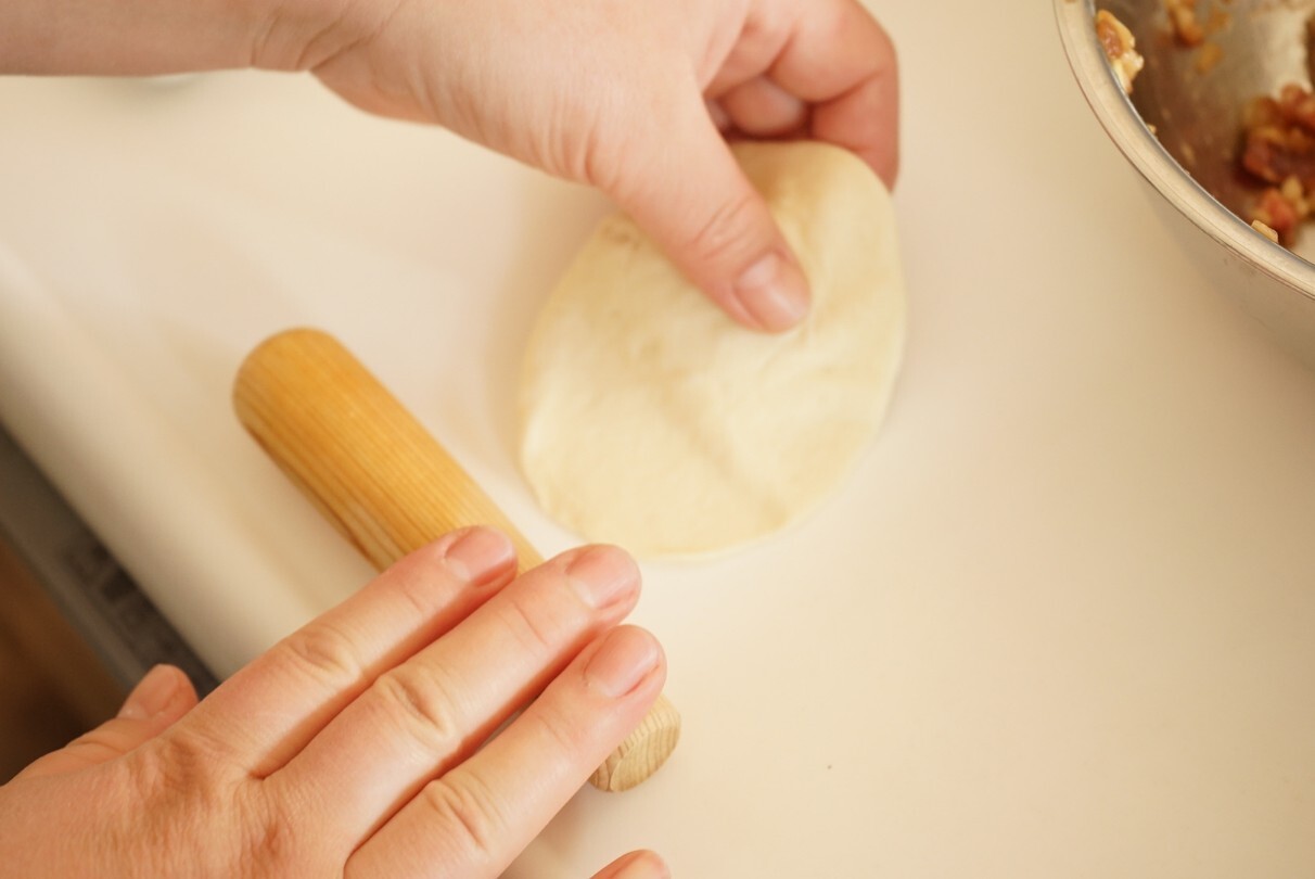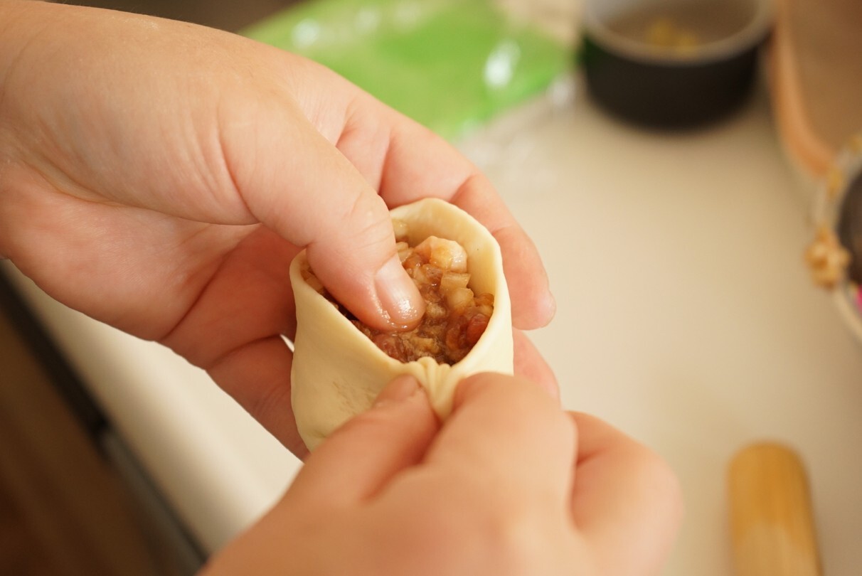 具材を包む時に具が皮の外側につくと生地が、くっつきにくくなるので注意してください。