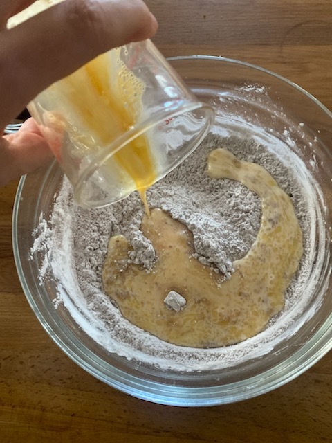 ボウルにBをふるい入れ、Cを加えてへらで混ぜ合わせる。(まだここでは粉っぽい状態)
