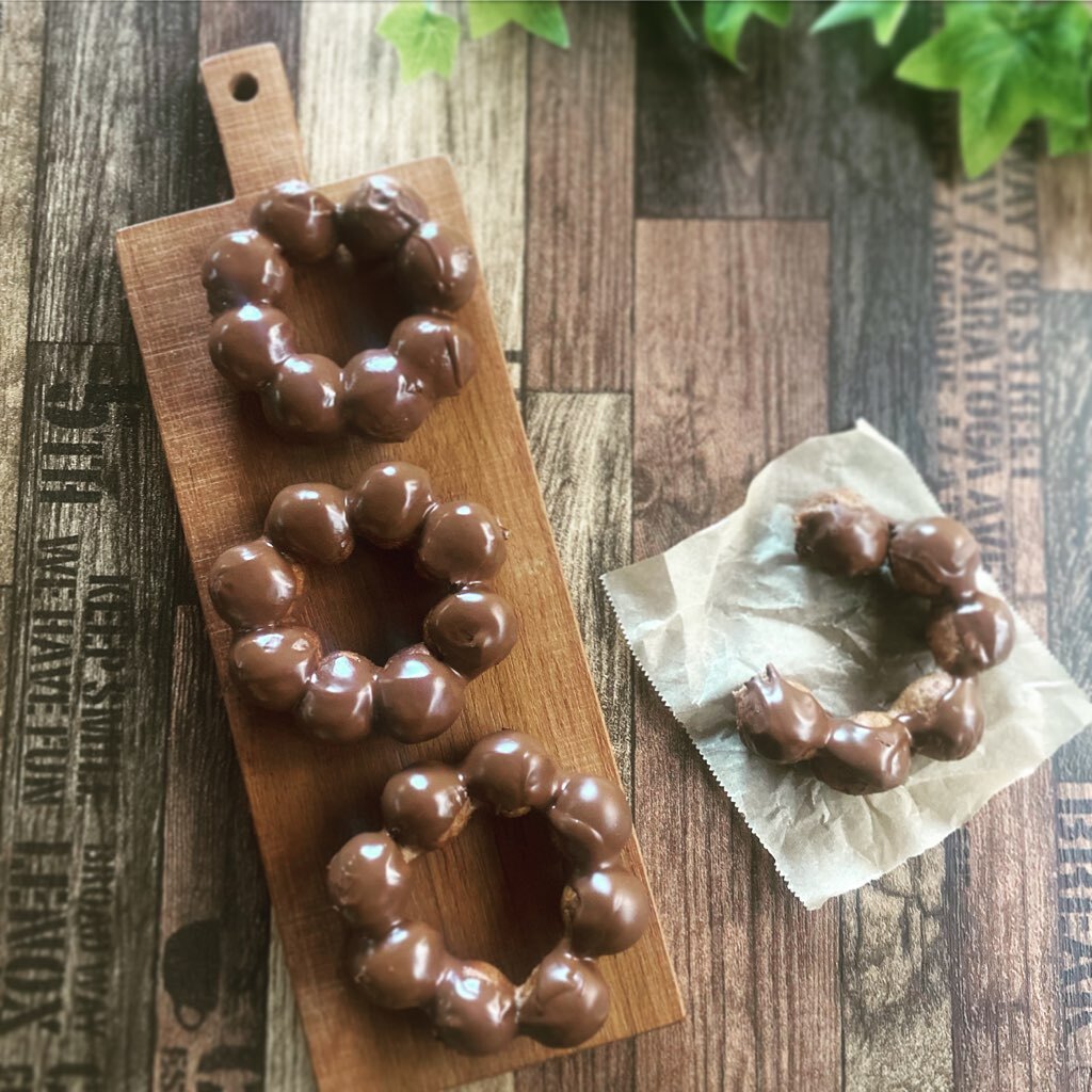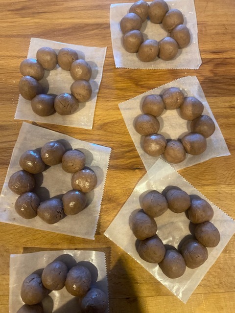クッキングシートの上に丸めた生地を8個並べてリング状にする。水でぬらしてつなぎめを止める)