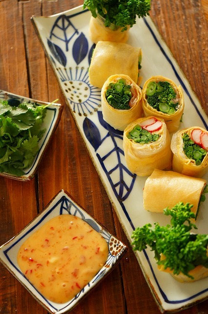 生春巻きは巻く際に片側だけ折って巻くと菜の花のつぼみの部分が出て見栄えがよくなります。