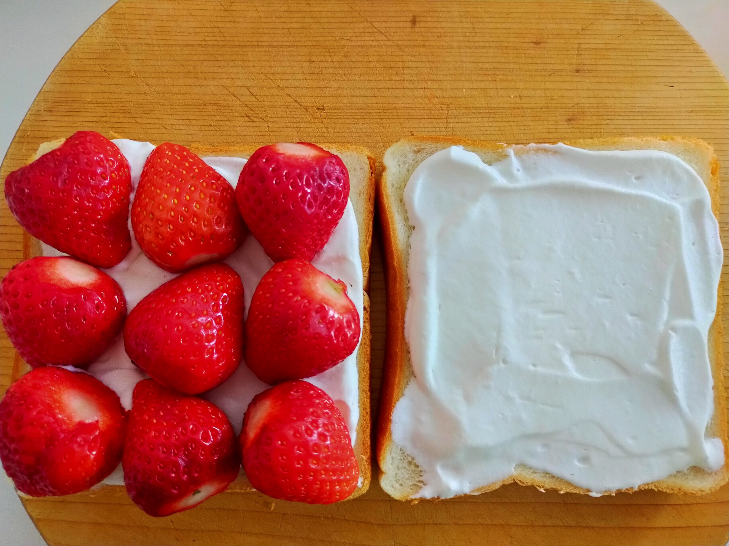 食パンに生クリームをのせ軽く広げ、片方のパンにいちごを並べる。もう一枚をのせてはさみラップで巻き冷蔵庫で2時間冷やして落ち着かせる。