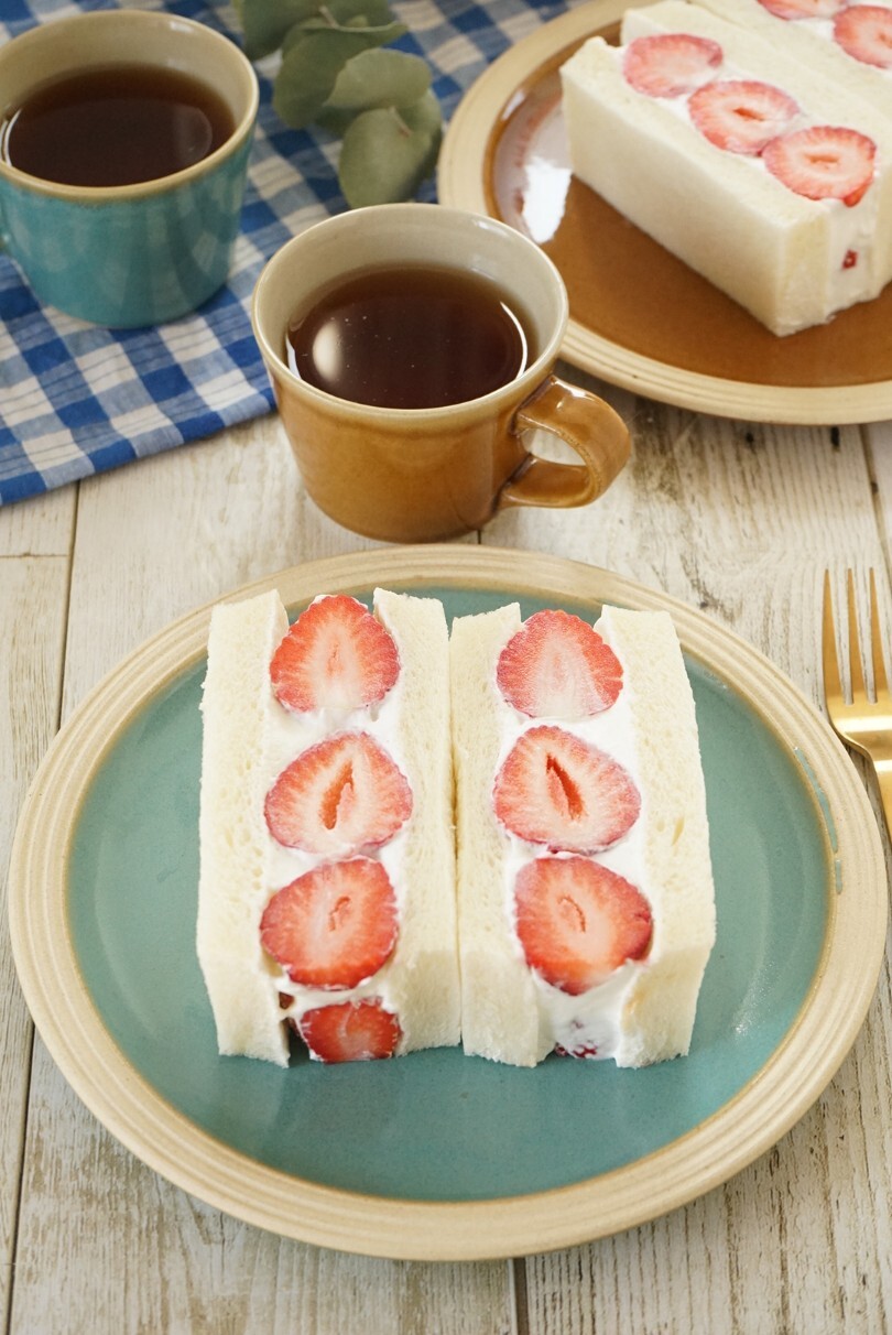 いちごの他にも旬にあったフルーツを挟むのがオススメです!切るときは潰さず、包丁を大きく動かしてきってください。切るときに方向がわからなくなりそうな場合はラップした後マジックで印をつけとくといいですよ。