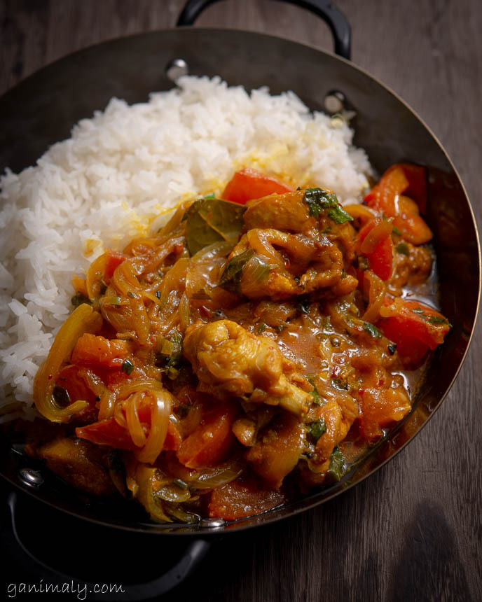 鶏肉は一口大に、玉ねぎは薄切り、トマトはざく切り、パクチーは粗みじんに切っておく。お米は炊いておく。