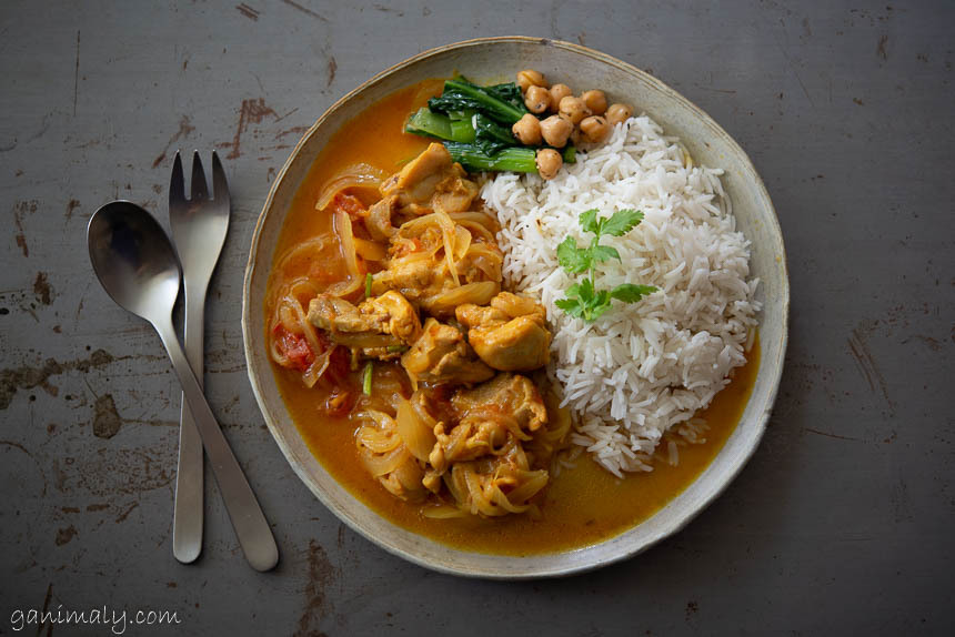 ネパールのカレーの作り方には簡単なものもあって、材料を香辛料等で炒め煮にします。玉ねぎを炒めたり、じっくり煮込まなくてもOKです。出汁もブイヨンも特に使いませんが、優しくおいしく仕上がります。