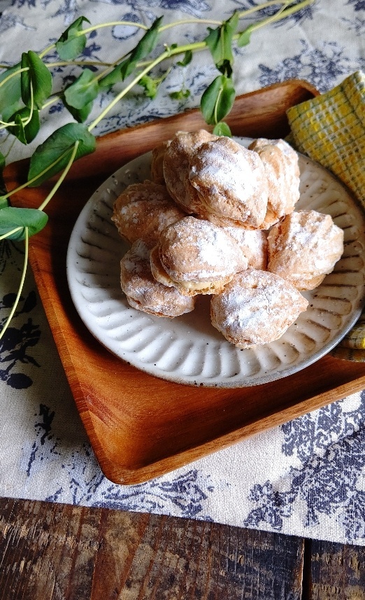 粉糖(絞った後ふるう用)をふるいかけ、2~3分置き、溶けて消えて来たらもう1度、雪が積もるように白く残る位にふるいかける。