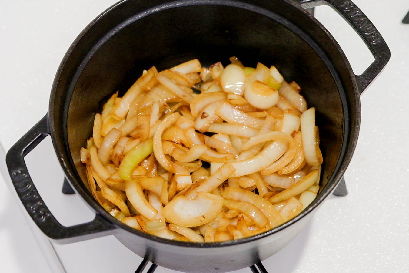 密閉性の高い厚手の鍋を温めて植物油をひいて、縦半分に切ってから輪切りにした玉ねぎを入れて、色づくまで炒める。