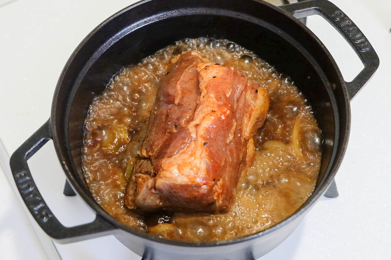 2の鍋の中央に1の豚肩ロース肉を置き、黒ビールを入れる。