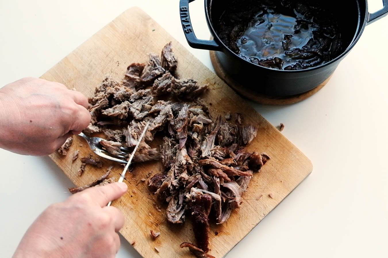 鍋から豚肩ロース肉を取り出してナイフとフォークで裂く。
