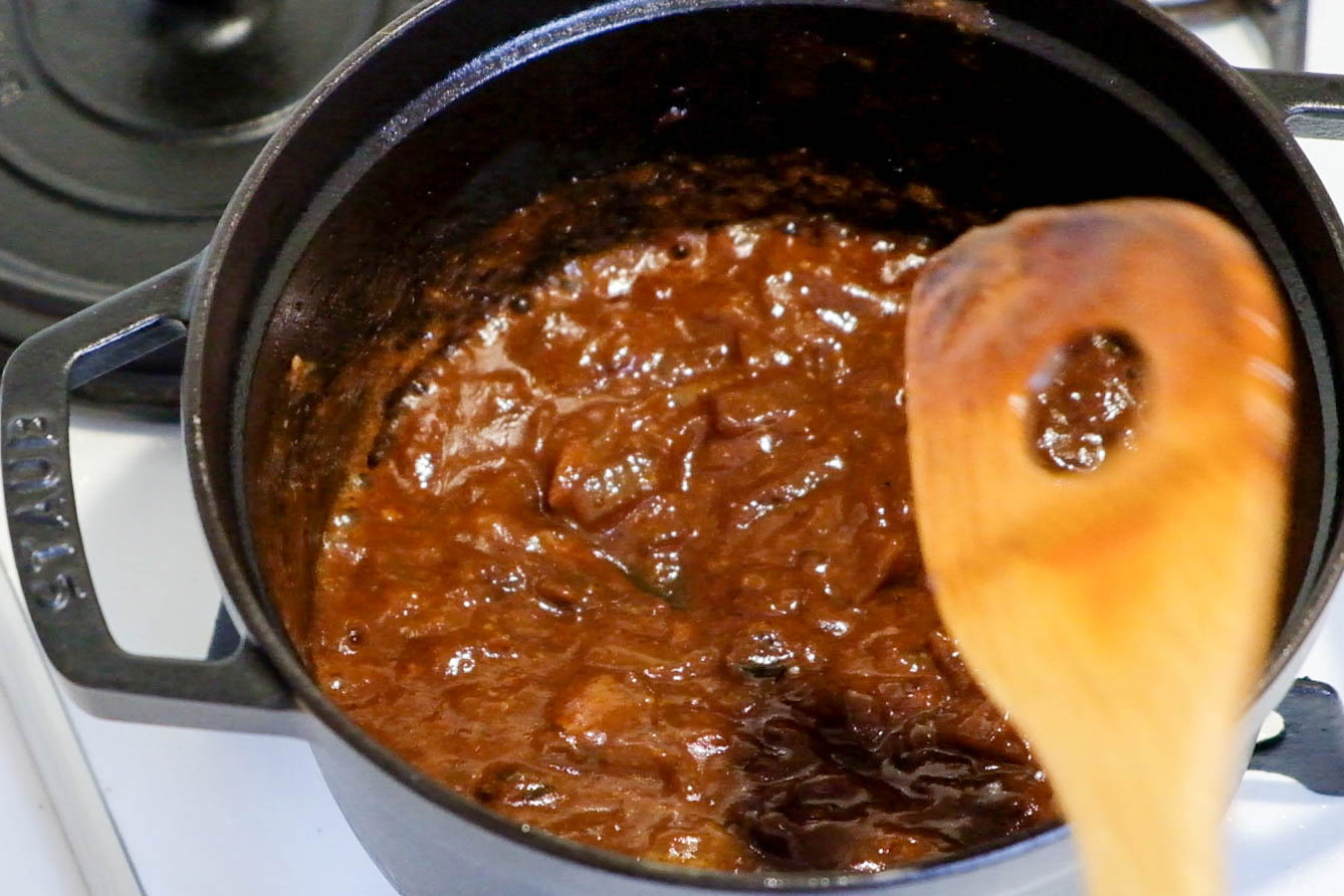 バーベキューソースにはスパイスたっぷりの肉汁と玉ねぎを使います。