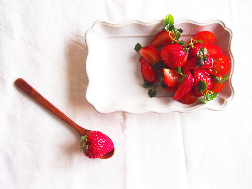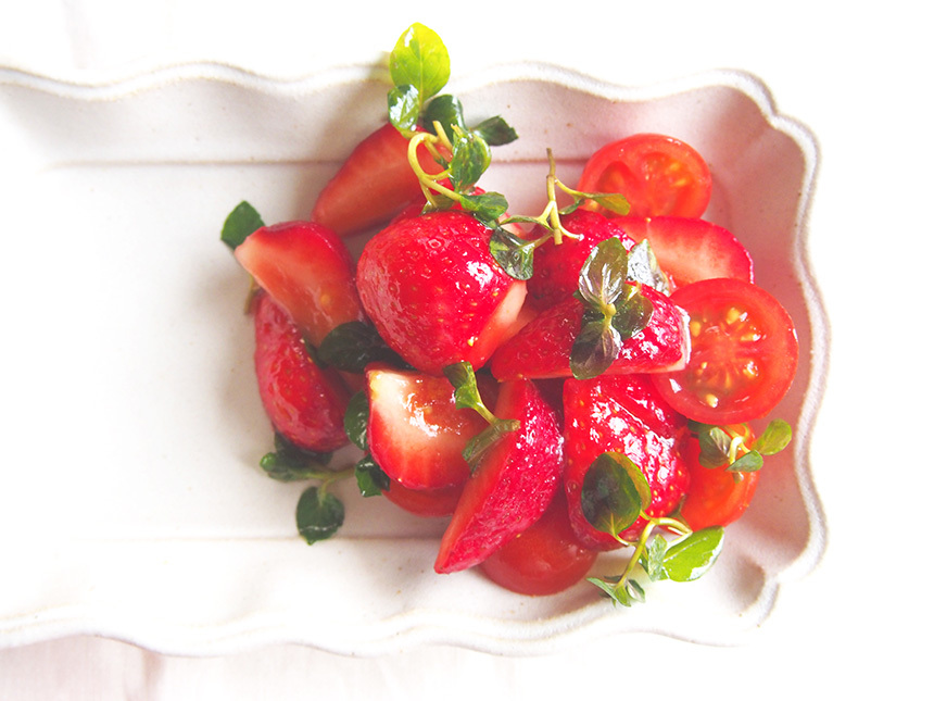 - いちごとプチトマト、ミントをオリーブオイルで和える。