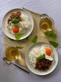 3.皿にご飯を盛り2を添え、卵を目玉焼きにし乗せお好みでバジル(分量外)を飾る。