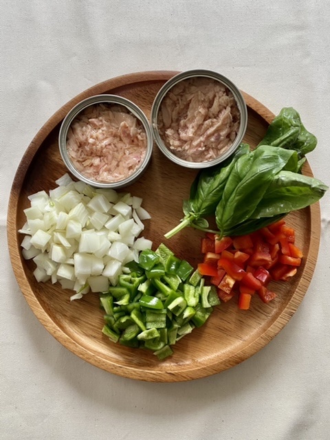 ・ピーマン、赤パプリカ、玉ねぎは1cmの角切りにする。 ・バジルは枝からはずしておく。 ・にんにくはみじん切りにする。