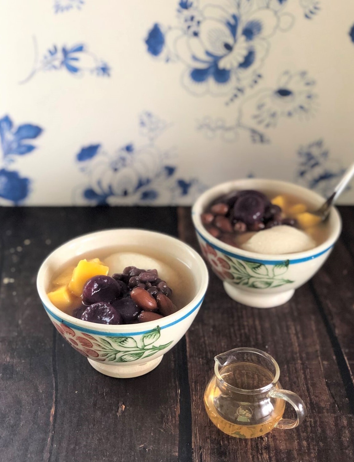 - 大きなスプーンで豆花をすくい、皿に入れる。紫芋団子、ピーナッツ、小豆、食べやすい大きさにカットしたマンゴーを盛りつけ、シロップをかける。