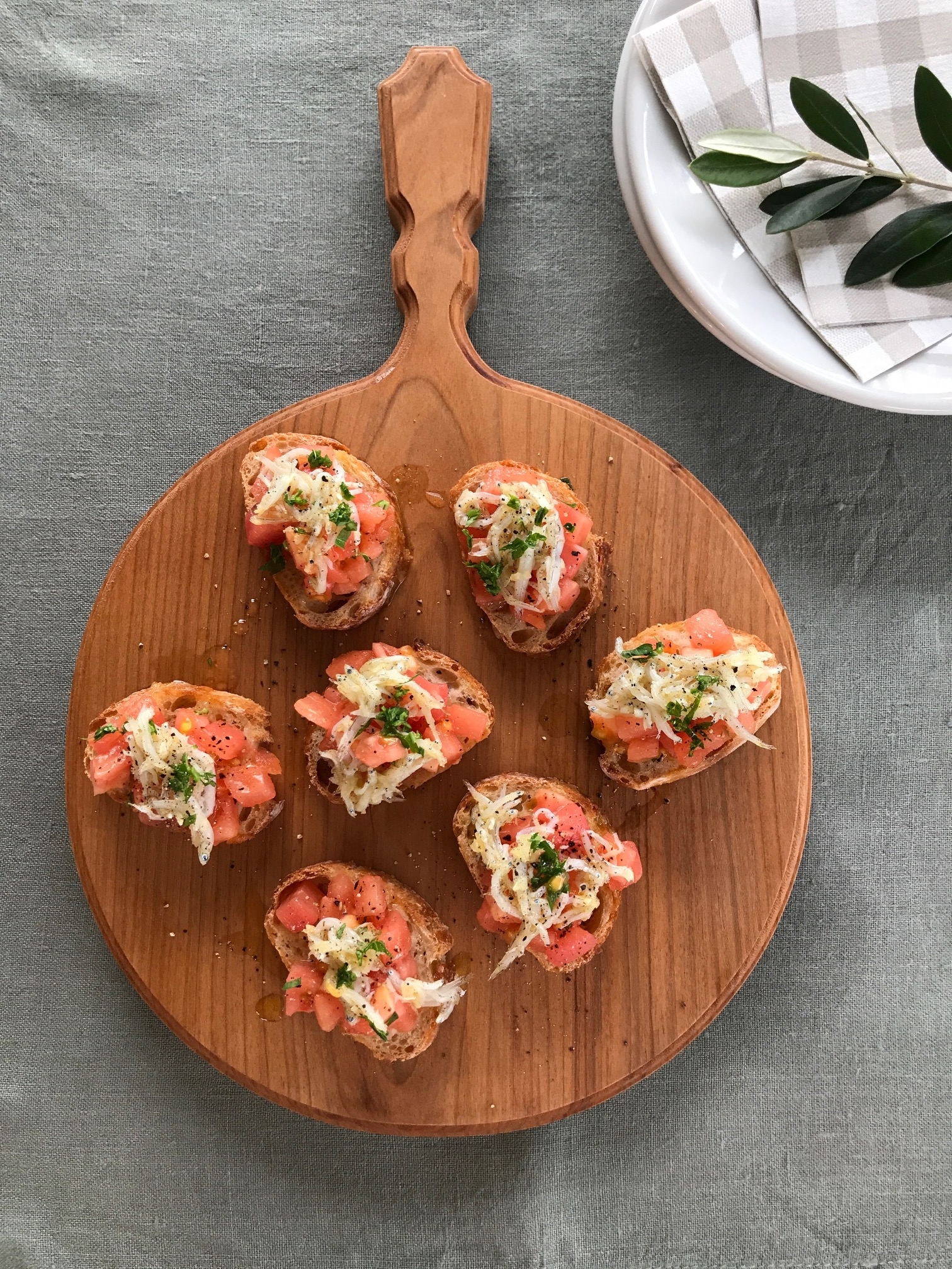 - トマトはへたをくりぬき、てっぺんに小さく十字の切り込みを入れる。沸騰した湯でさっと湯通しして冷水にとり皮をむき、1センチ角に切る。ボウルに、イタリアンパセリ、Aと合わせて混ぜる。