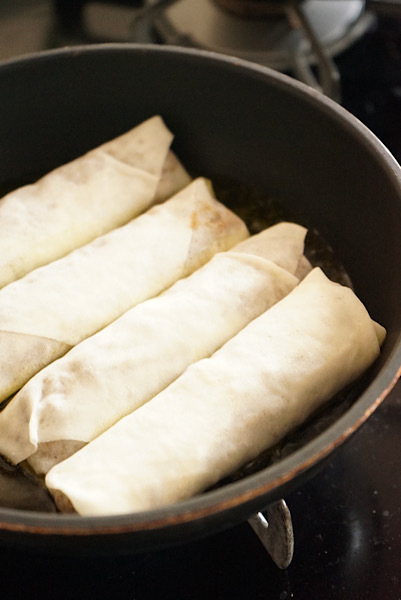 フライパンに1cm深さのサラダ油を入れ中火に熱し、箸から泡が出始めたら春巻きを並べ、きつね色になればびっくり返し、全体を2から3分揚げ焼きしていく。