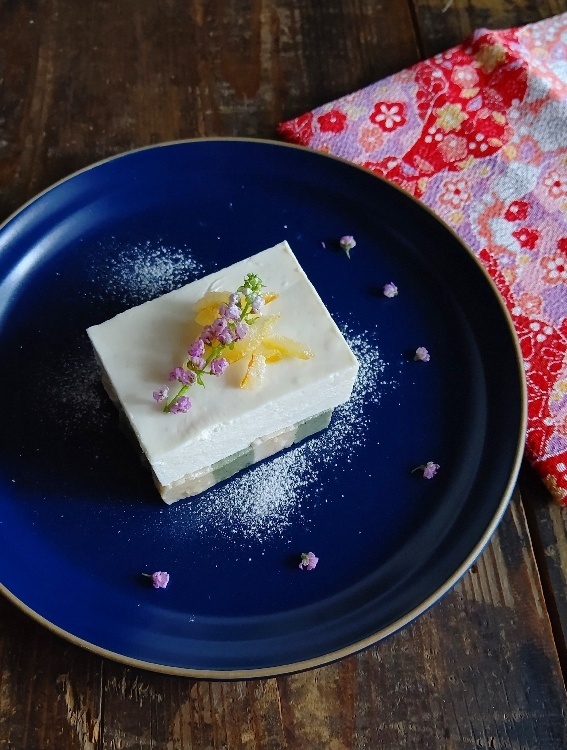 クッキー生地のザクザク感とはまた違い、生麩のモチモチ感はレアチーズだからこそ生かせるかもと考えました。作る中で少し手間ポイントですが、あわ麩と蓬麩で市松模様にしたのも、和をイメージしたポイントです。