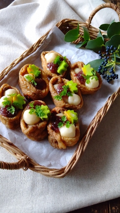 - ④ ②の油揚げを開き、内側半分に折って袋状に開く。③の団子を3個ずつ詰める。残り1個ずつを上に乗せ、つぶ餡と5mm厚さに切った生麩、セルフィーユを飾り、皿に並べて盛り付ける。