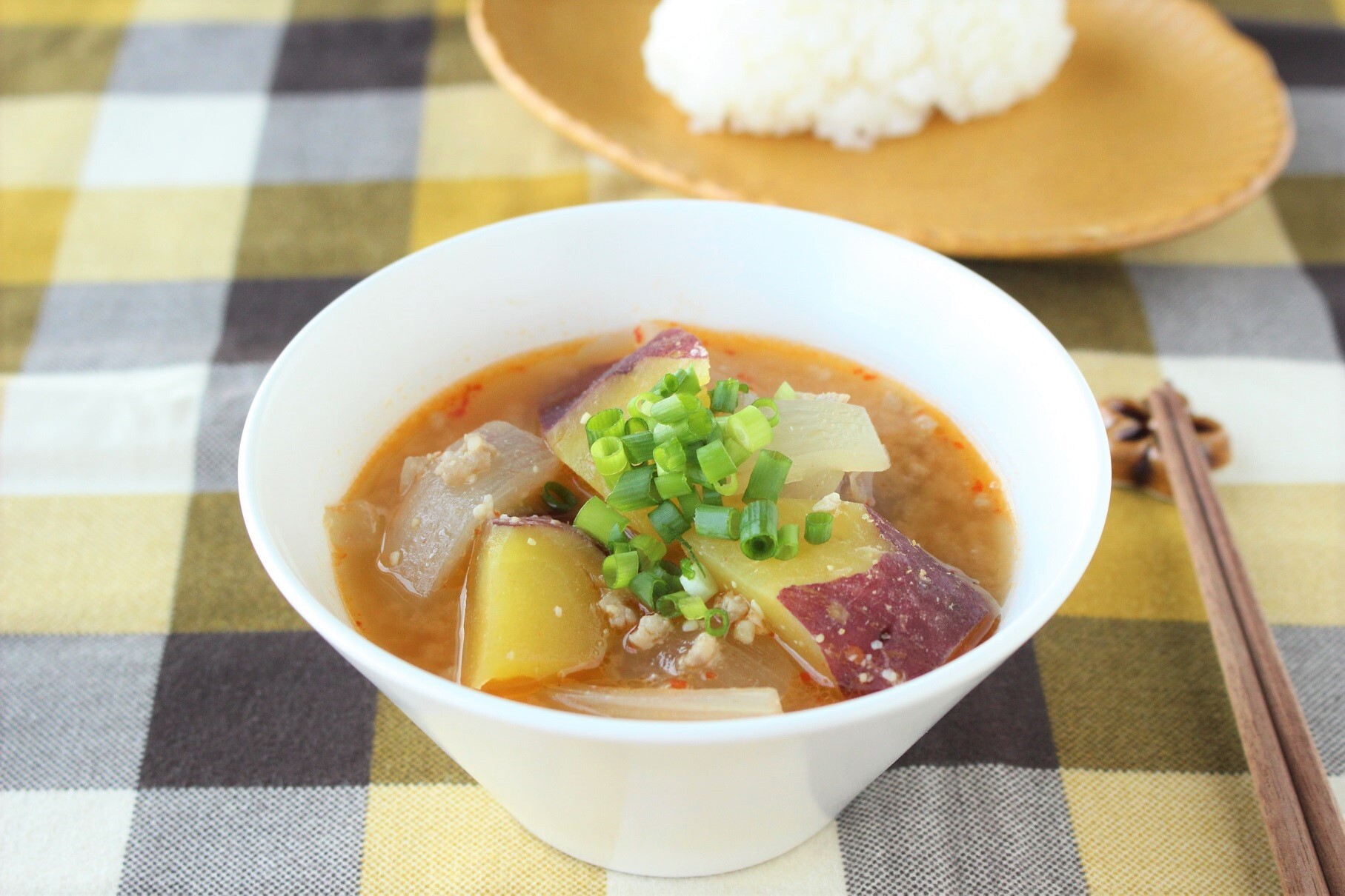 さつまいもと豚ひき肉を使った、ご飯が進むおかず味噌汁。豚肉の旨味とピリッと辛いアクセントが、さつまいもの優しい味わいを引き立てます。