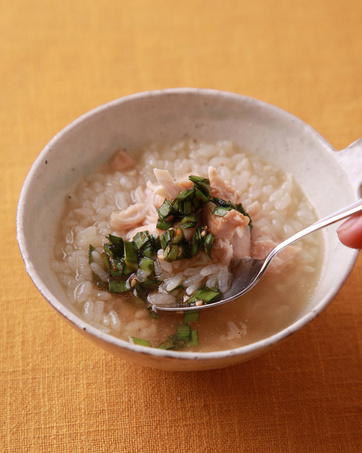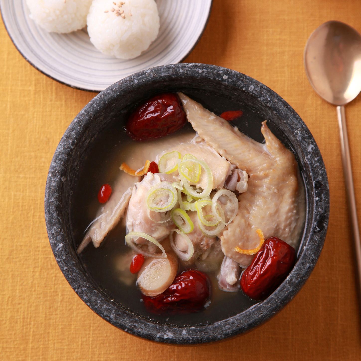 丸鶏を使わないので、はじめはおにぎりと一緒にどうぞ。残ったスープは、ニラのジャンを加えて鶏粥に。ひとつの参鶏湯で二度おいしい食べ方が楽しめます!