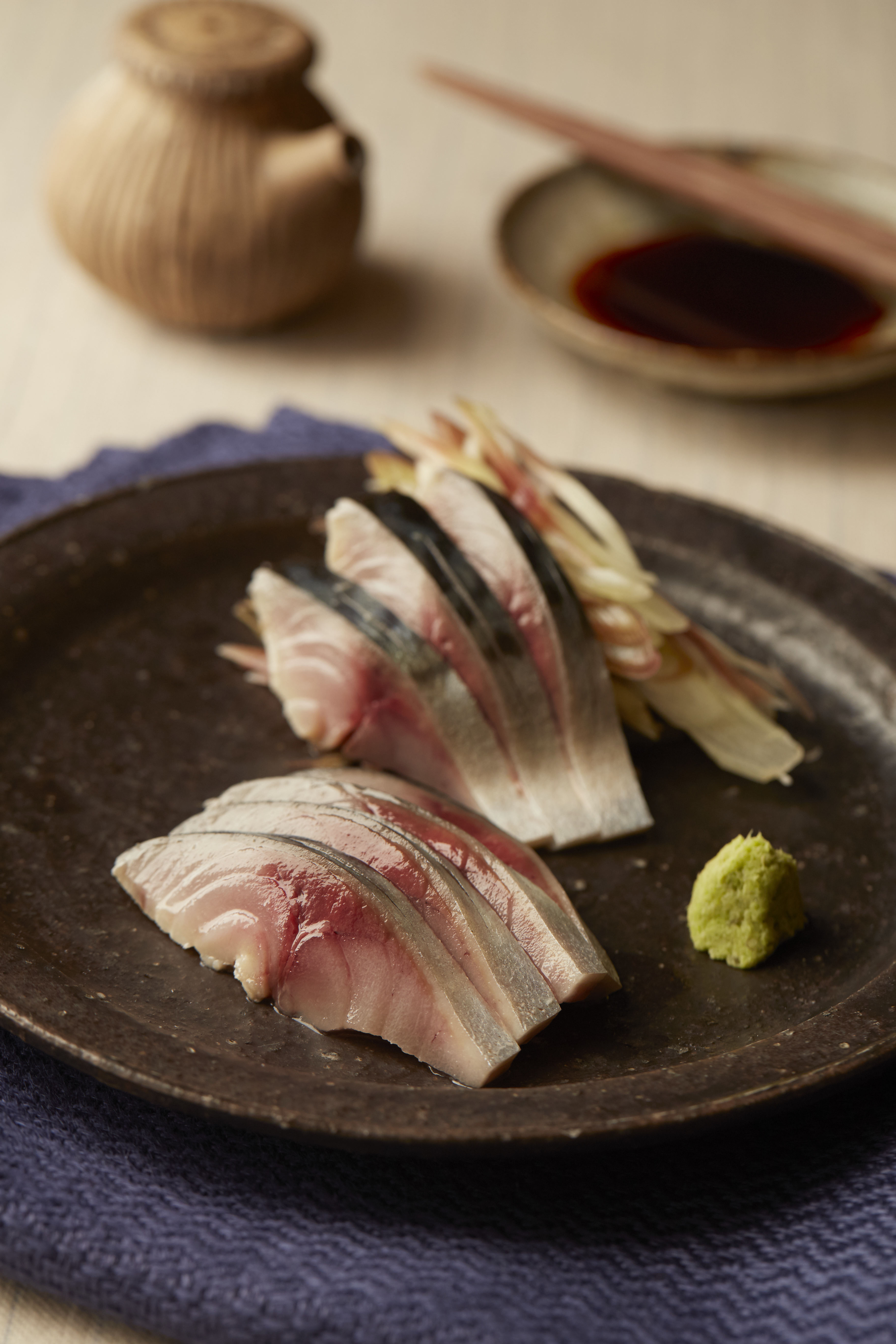 みょうがを器に盛り、さばを盛り付け、わさび、醤油を添える。