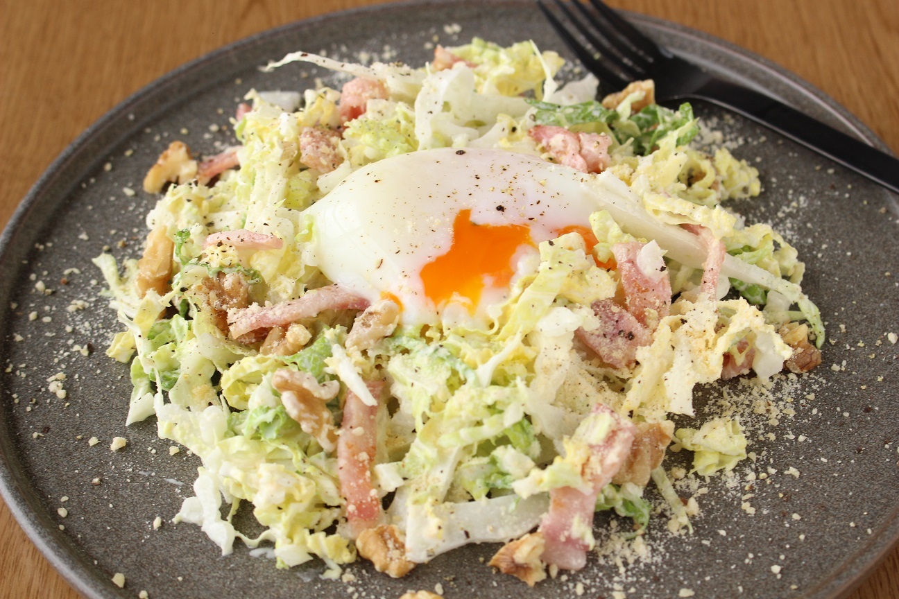 - ボウルに白菜・ベーコン・クルミ・Aを入れ混ぜる。器に盛り、温泉卵・ブラックペッパー・パルメザンチーズをかける。