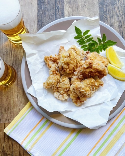 生姜たっぷり、ニンニクなし、味付けしっかり派の衣ザクザク唐揚げです!少し竜田揚げに近い味付けです。