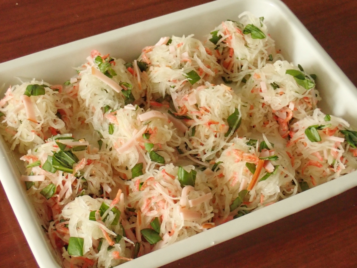 - 大根は皮を剥いて千切りにし、バットに広げ塩を振って10分置く。春巻きの皮は1枚を縦3等分に切る。ハムは2〜3cm長さの細切り、バジルは粗みじん切りにする。