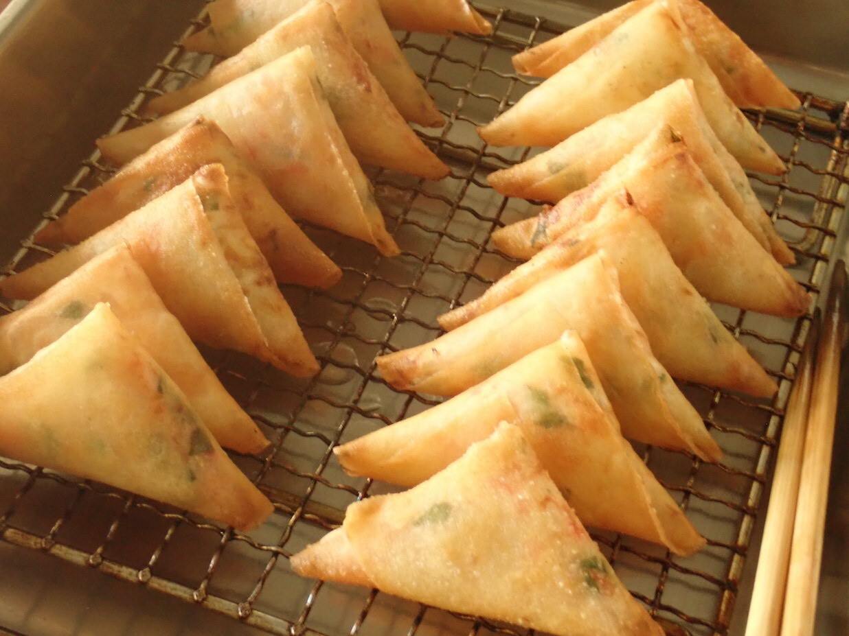 - 春巻きの皮を縦に置き、手前に③の1/12量をのせ、三角形になるように包む。巻き終わりを水溶き小麦粉でとめる。同様に12個作る。