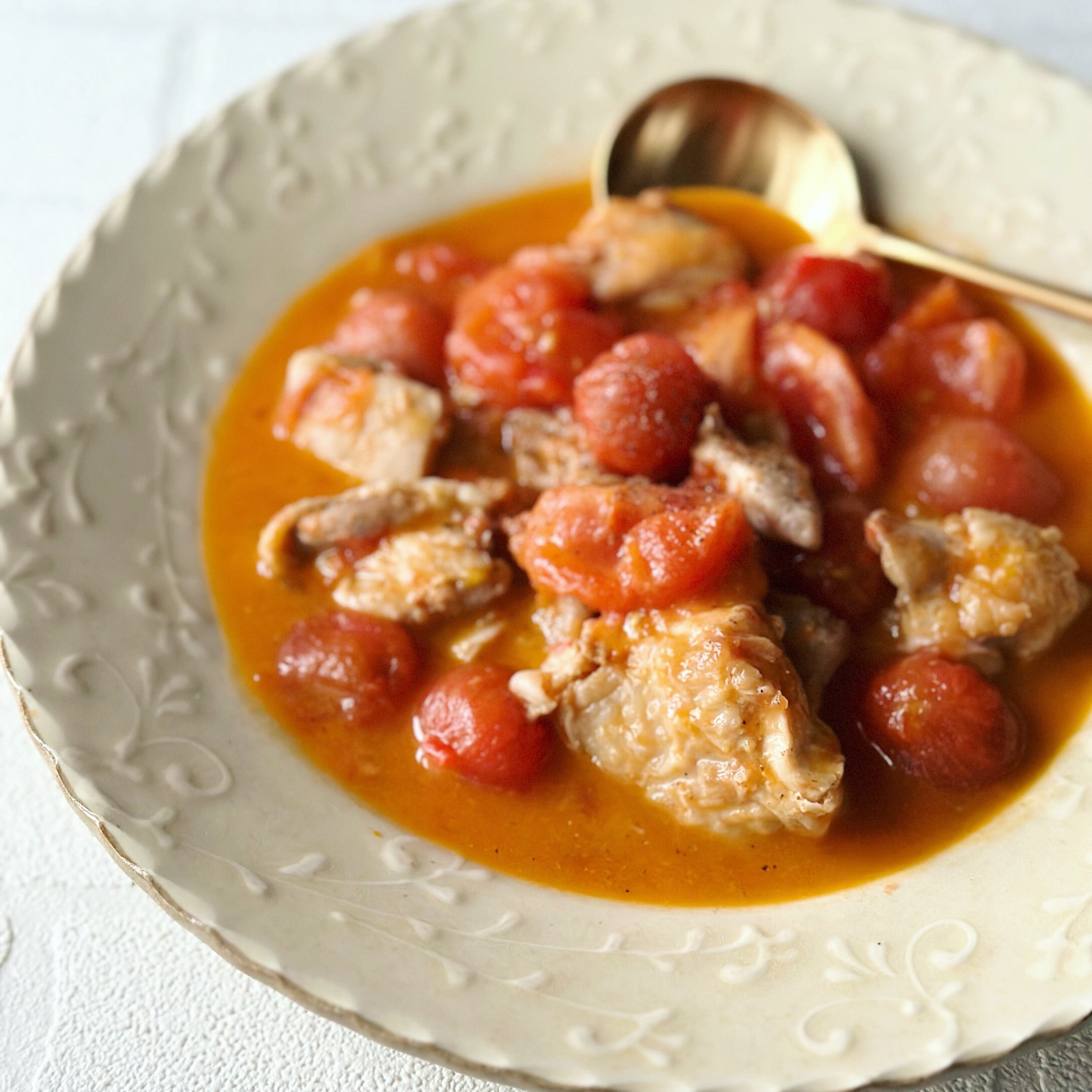 - 白ワインを加えて煮立てたら、ミニトマトと塩少々を加え、蓋をして弱火で10分間煮る。