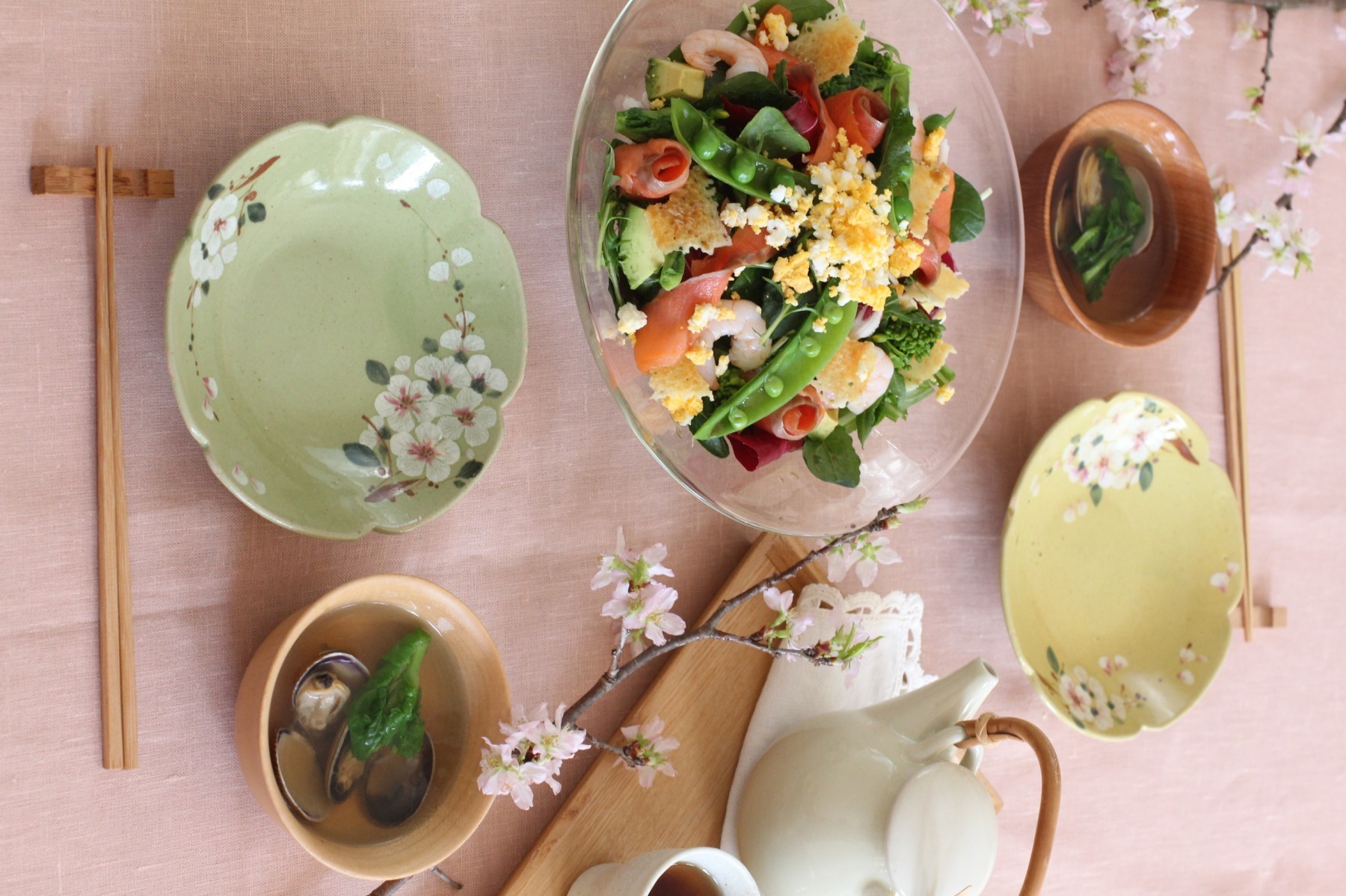 - 器に②の酢飯を盛り、③のトッピングの材料をのせる。仕上げに①のドレッシングをかける。