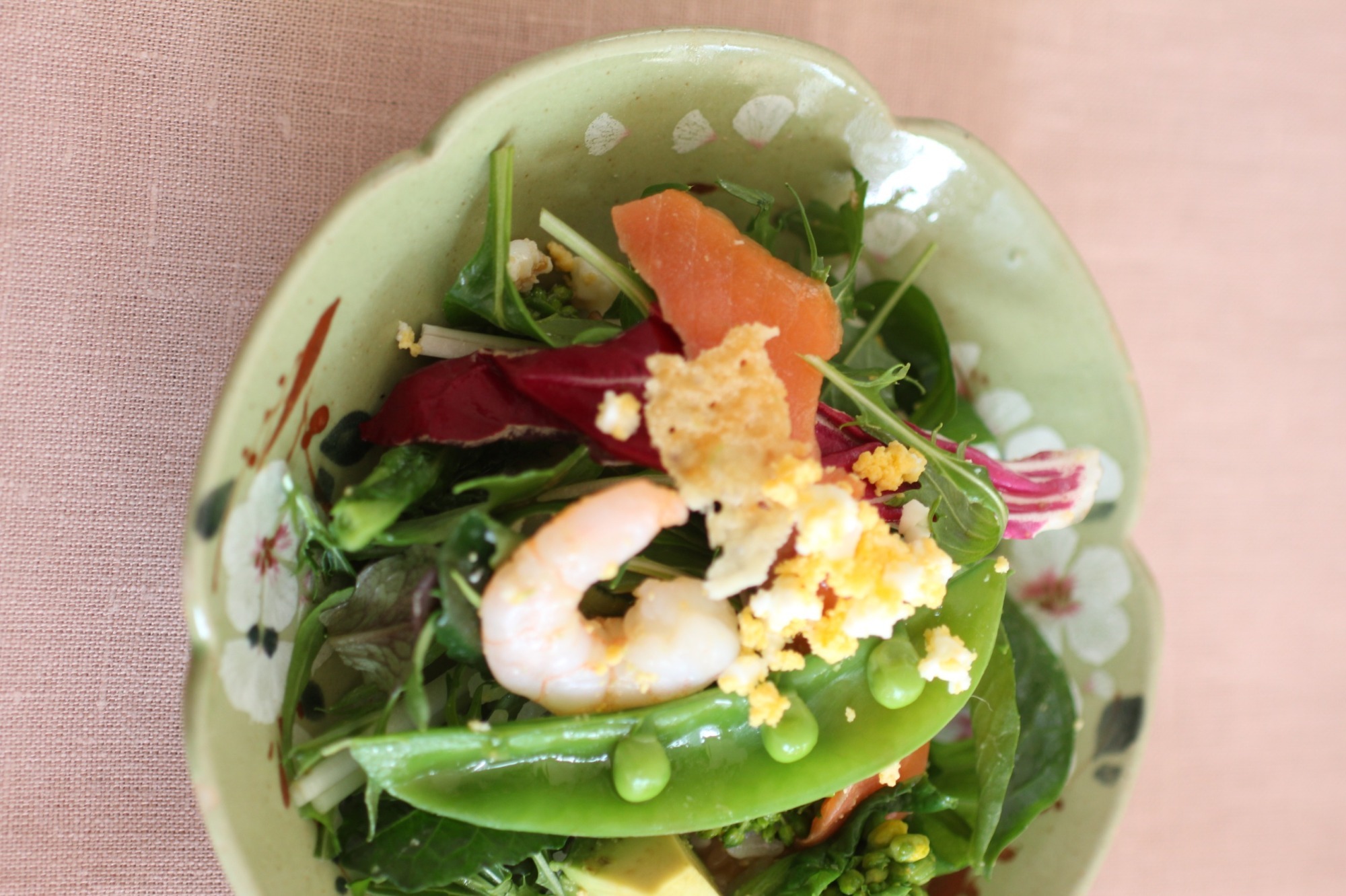 - アボカドは1cm角に切る。菜の花は茹でて2cm幅に切る。水菜は2cmに切る。スナップえんどうは茹でて半分に分ける。スライスチーズはクッキングシートにのせ、電子レンジ600w1分30秒加熱する。カリカリになったら、食べやすい大きさに切る。ゆで卵は白身と黄身を分け、それぞれみじん切りにする。