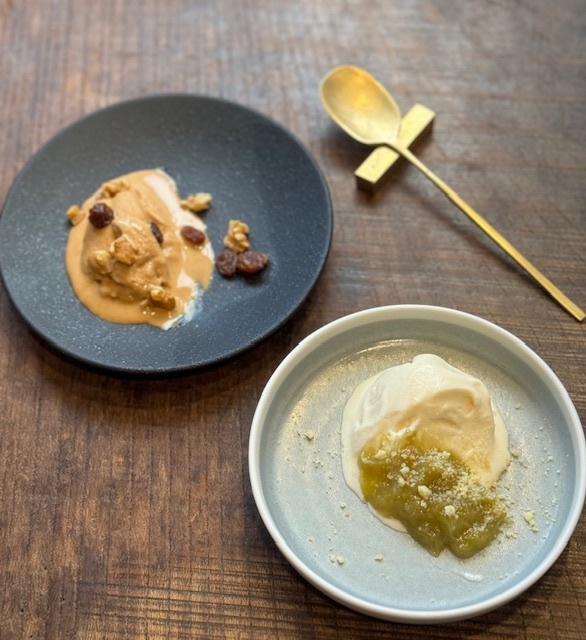 白い方はジャムを(写真は自家製のルバーブジャムを添えています)、茶色の方はナッツやドライフルーツを添えています。日本酒と合わせても楽しいですね。