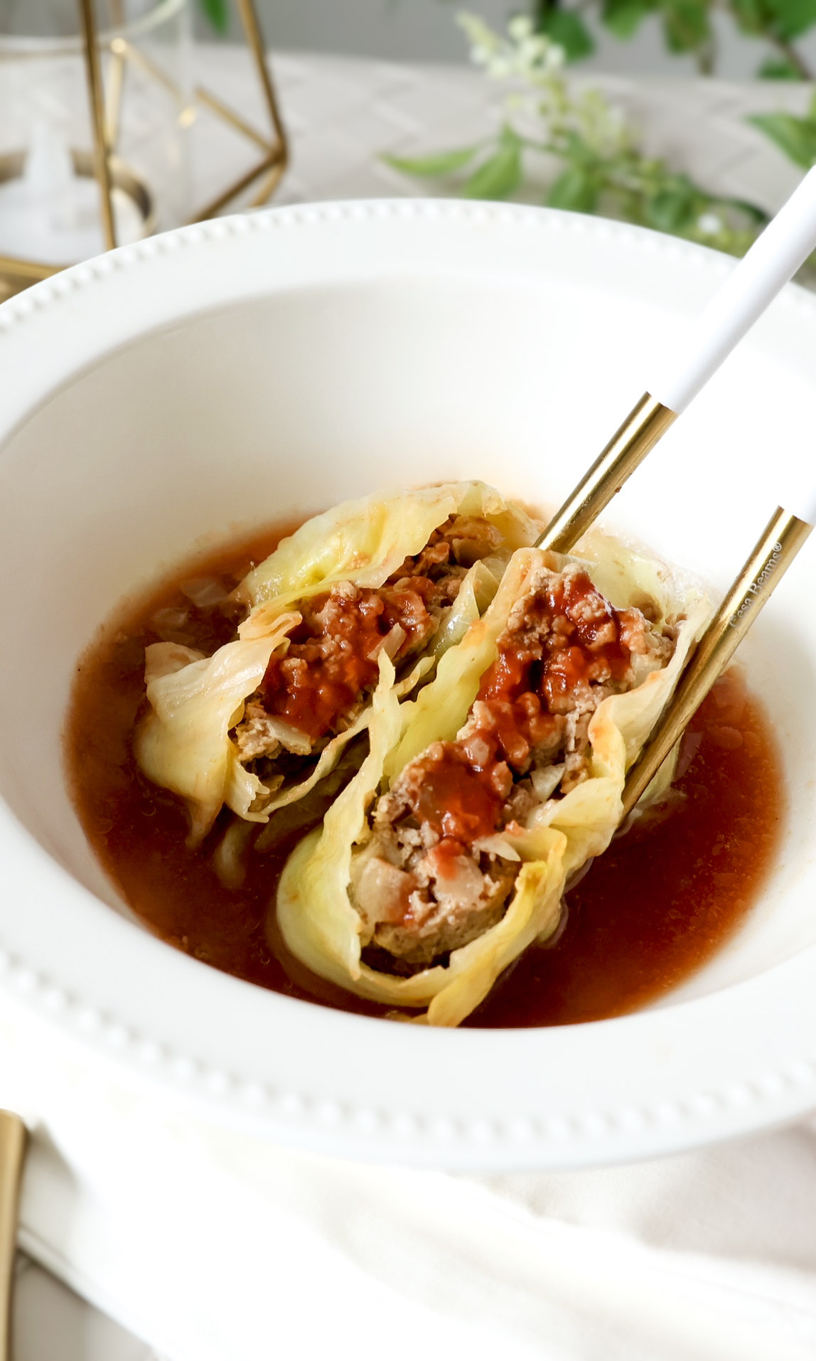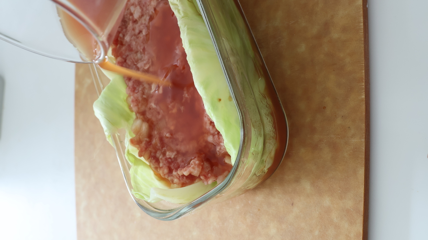 トマトソースを混ぜ合わせ、流し入れ、キャベツでふたをする。