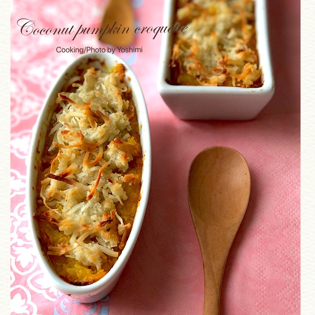 - 細か目パン粉、ココナッツラペ、煮詰めたココナッツミルクの残り、オリーブオイルをあわせてよく混ぜかぼちゃの上に散らす。