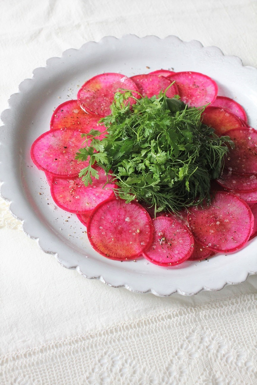 紅芯大根をスライサーで薄切りにし、冷水にさらして水けをよくきる。