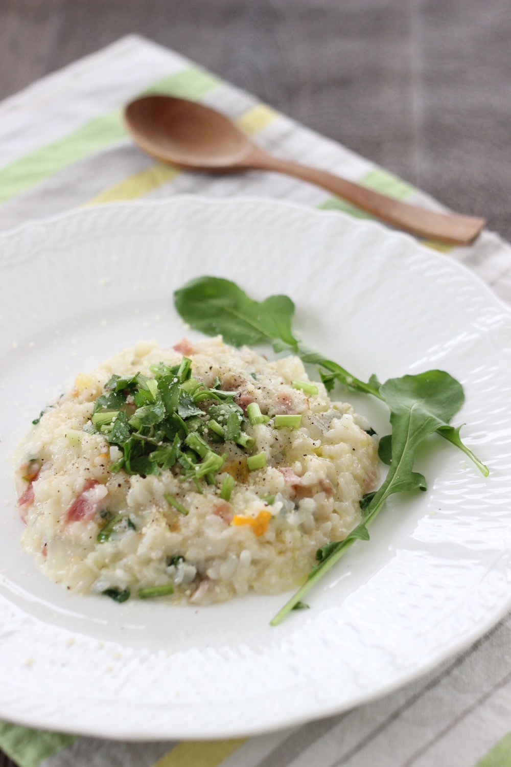 冬野菜を入れたほっこり温まる優しい味のリゾットです。胚芽玄米と白米を半々にして炊いたご飯から作りました。