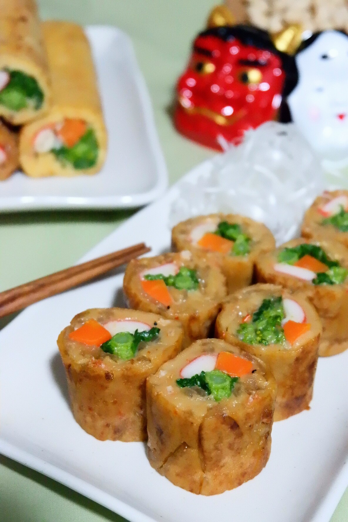 - 卵焼き器に胡麻油(分量外)を薄く塗り中火で熱し、3を1/4量流し入れて1の菜の花(2本)・人参(1本)とカニカマ(2本)を並べて巻き、まわりに焼き目をつける。