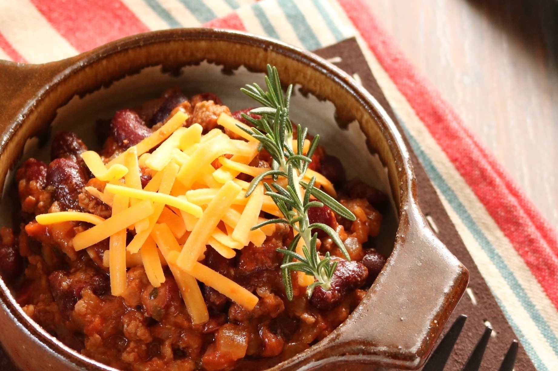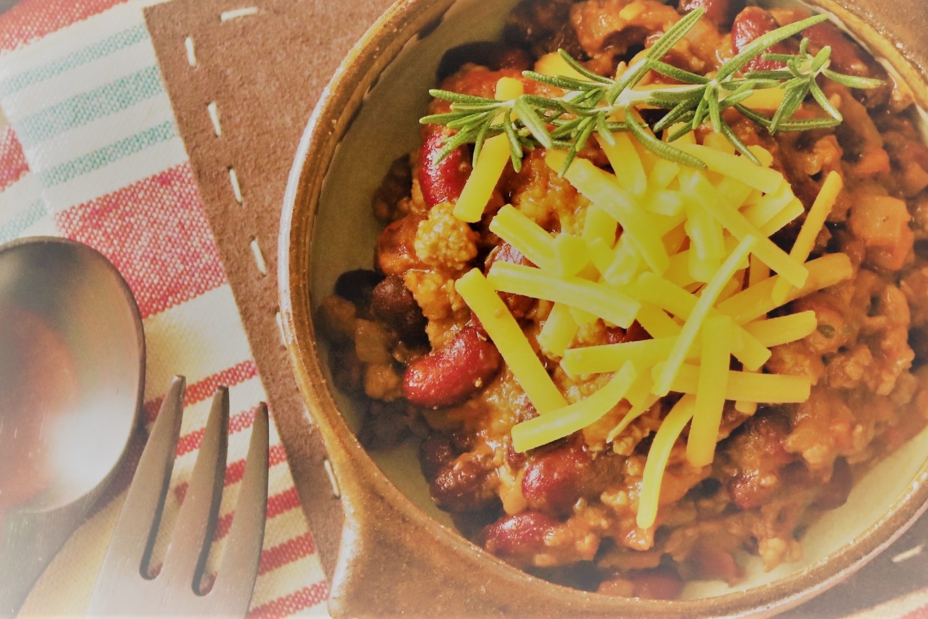 - ホールトマトを加えて木べらで潰しながら板目合わせ、レッドキドニービーンズとAを加えて混ぜ合わせ、3分炒め煮する。