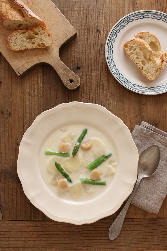 帆立とアスパラガスを軽いクリーム煮にしました。とろみ付けには米粉を使っています。