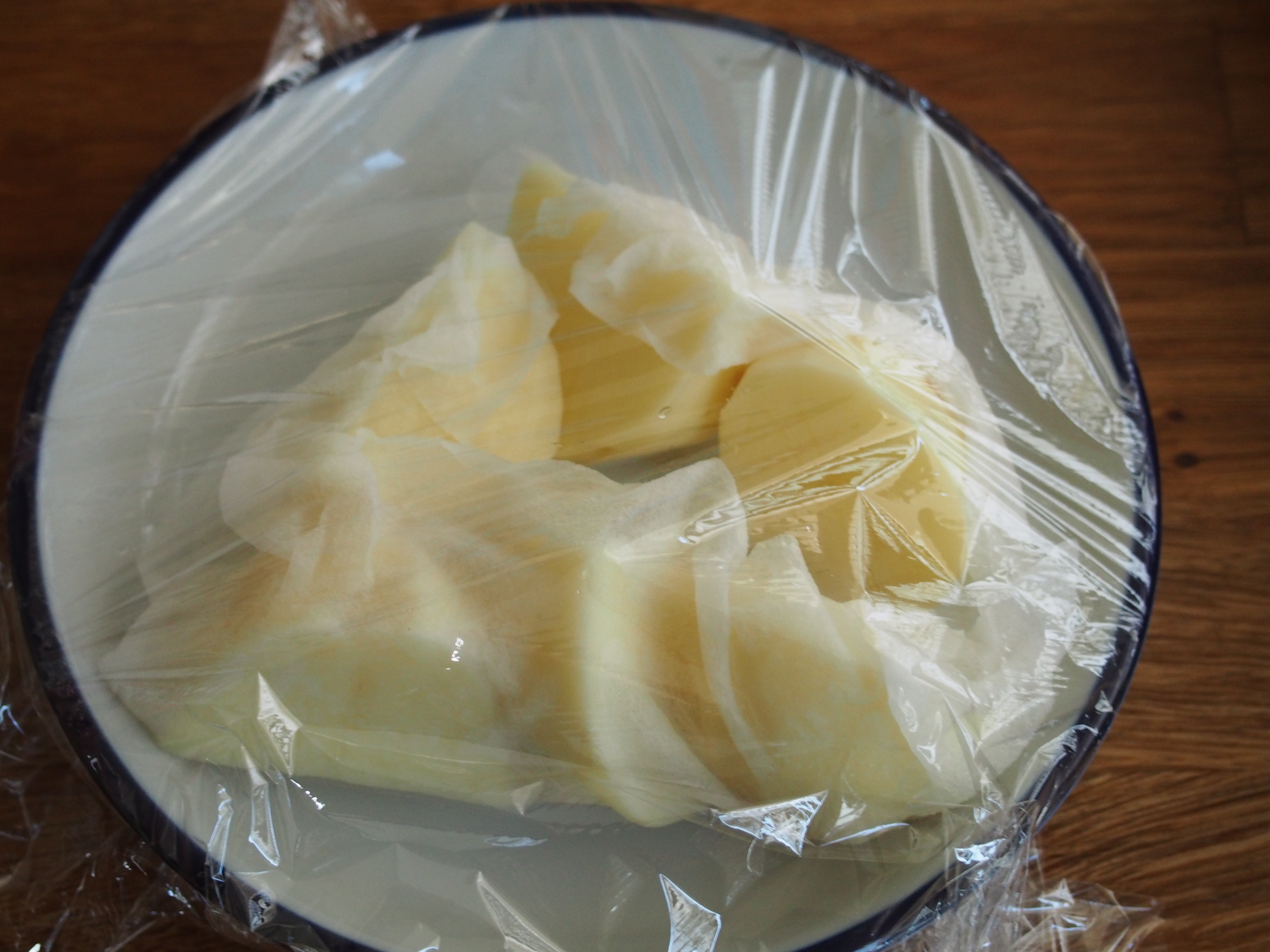 じゃがいもは皮をむき2㎝角に切り耐熱皿に乗せ、濡れたペーパー、ラップをかけレンジに500w3分かける。じゃがいもの上下をかえし、再度500wで2分かけ竹串で柔らかくなってるか確認し、温かいうちに潰しておく。