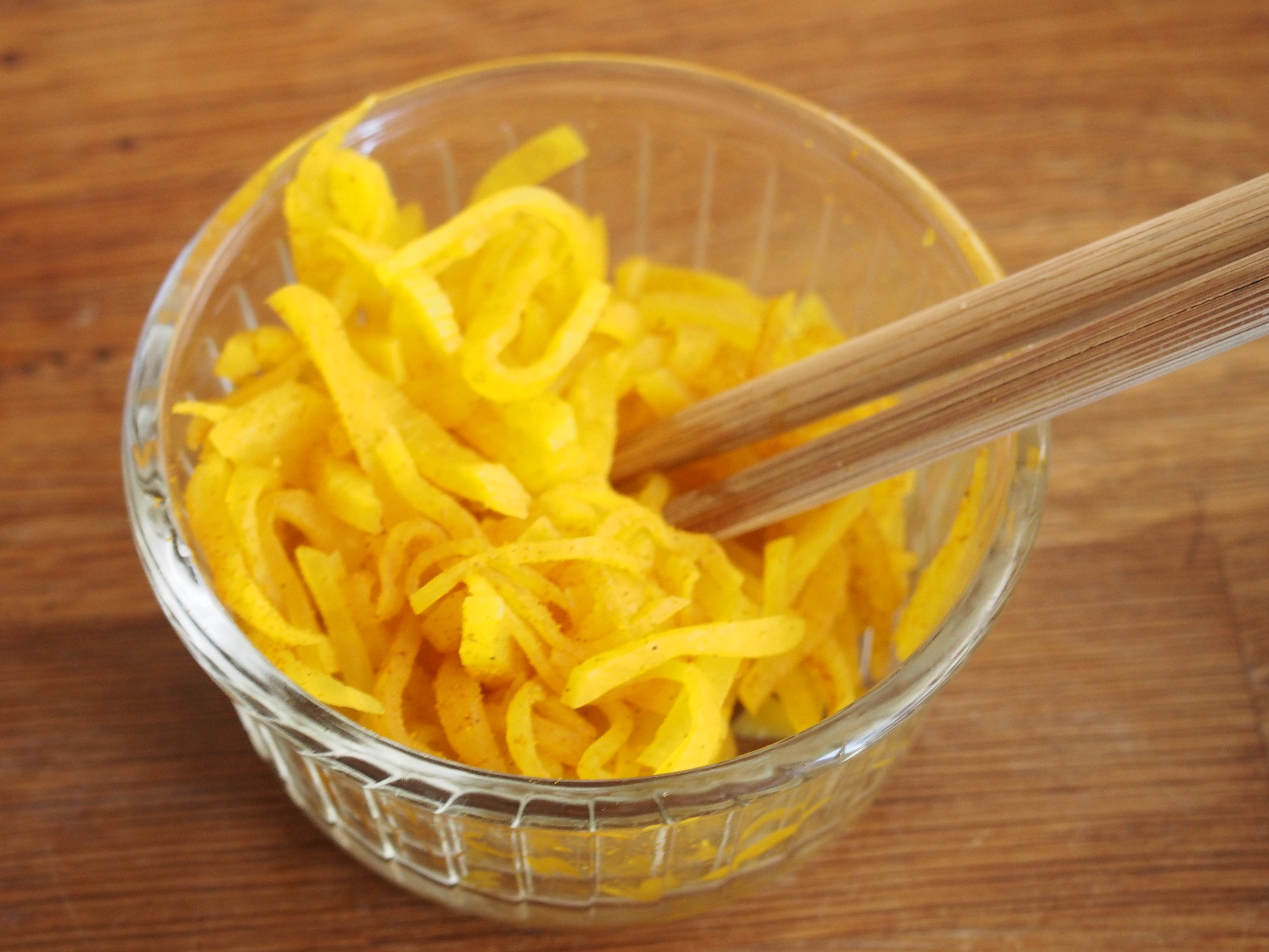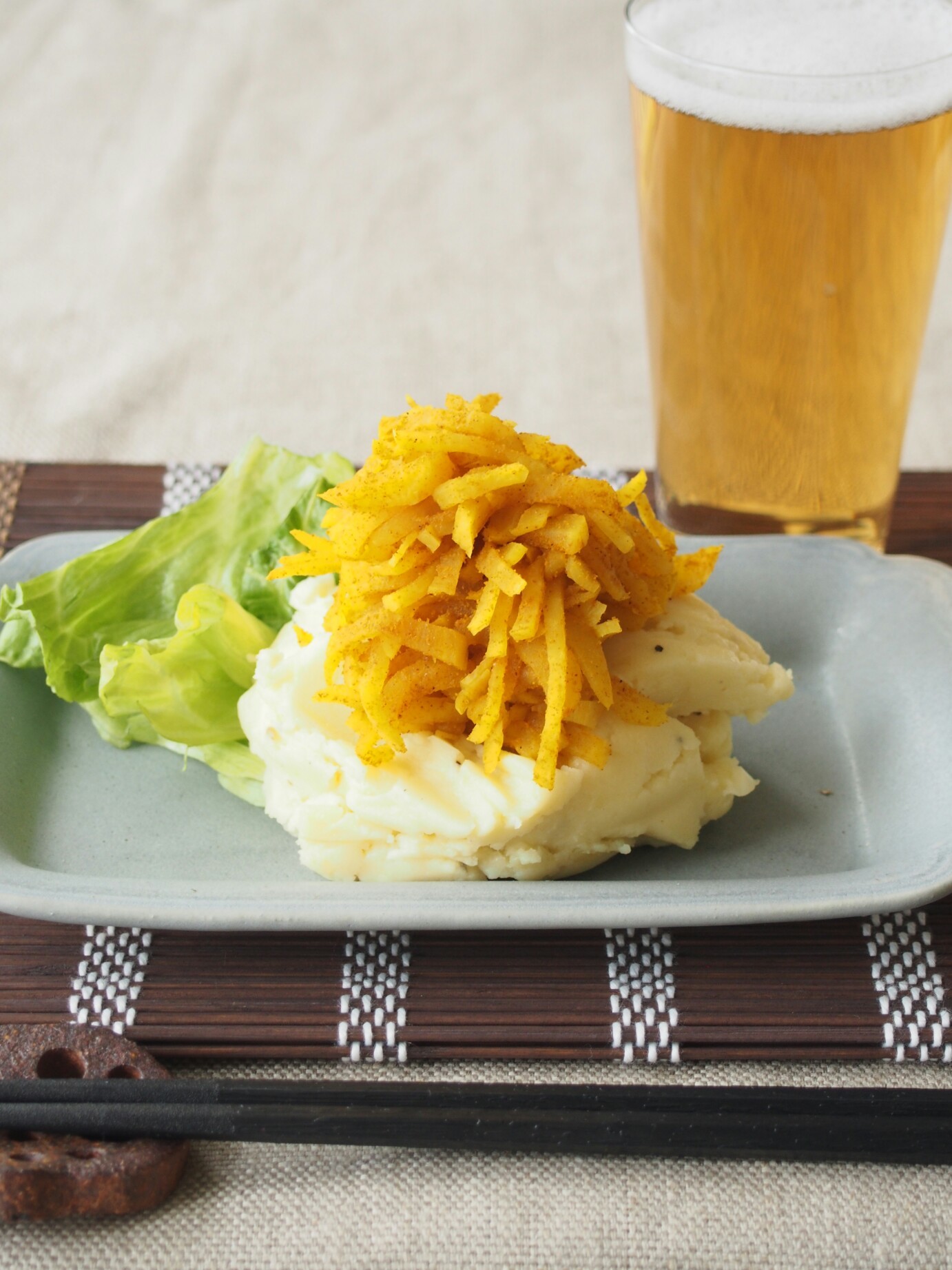みんなが大好きなポテトサラダにカレー粉をまぶしたたくあんを乗せて、食欲そそる簡単おつまみです。