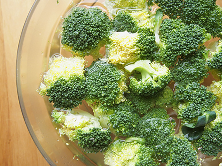 ブロッコリーや菜の花は水につけ、ふり洗いする。