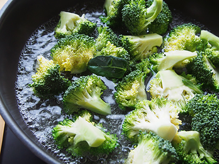 フライパンに1cmほど水を張り、沸騰させたところにブロッコリーを入れ、約3分茹でる。