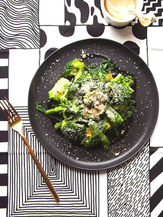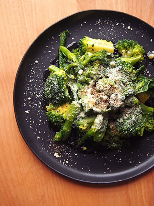 春をいち早く感じさせる「菜の花」と同じアブラナ科の「ブロッコリー」はともに栄養価の高い緑黄色野菜です。パルメザンチーズとオリーブオイルを絡ませ、コショウを多めに加えることで、ローマの名物パスタ料理カチョエペペ風に仕上げました。