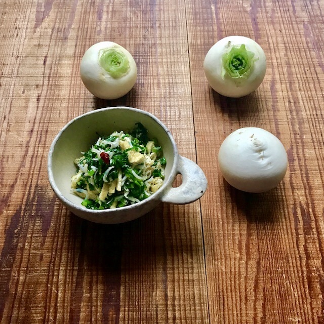 - 2にかぶら葉を入れ 酒と麺つゆで炒め煮にして煮上がりにじゃこを加える。