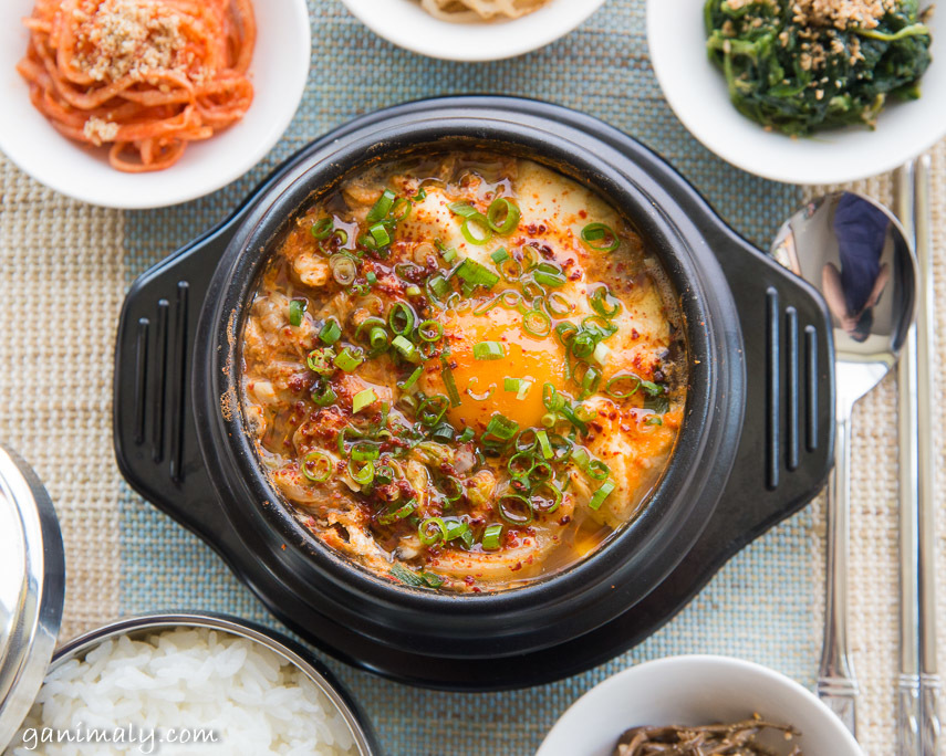 - 2に残りのキムチを入れて、絹ごし豆腐をスプーンで取りながら入れ、タマゴを落とす。さらに、唐辛子フレークを振り、塩を加えて、再度沸騰したら、1分ほどそのまま煮る。