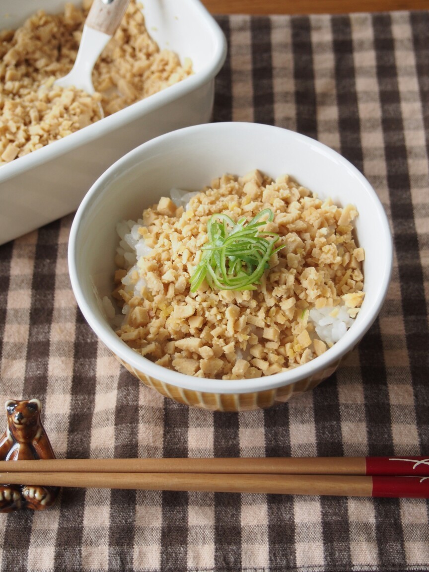 お肉を使わずに高野豆腐を使ったそぼろ。味噌を入れてコクが入り甘辛い味付けなのでご飯にピッタリ!サラダの上にかけても美味しいですよー!